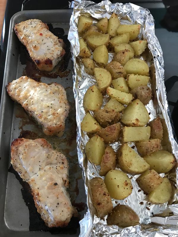 Slice 3 of the potatoes, dice 1/2 of the onion. Peheat oven to 450 degrees. Sprinkle salt and pepper over chops and potatoes. Remove potatoes from the oven and place pork chops on the baking sheet with the potatoes. Pat pork dry with paper towels and season with pepper. Sprinkle with remaining 1 tablespoon seasoning; Place pork chops on greased half of pan; Heat vegetable oil in skillet over medium high heat. Season with salt and pepper, to taste. An all in one dinner with tender and juicy pork tenderloin combined with potatoes and carrots. Pork chops are done when internal temperature is 145°(f) when checked with an instant read thermometer. Add olive oil, salt, pepper, garlic salt, thyme and remainder of maple syrup. In a small bowl mix together the ranch seasoning, smoked paprika, oregano and black pepper.